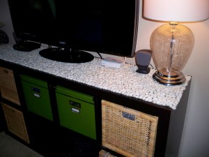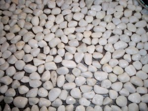 I know you’re just chomping at the bit to hear the story. Do I even need to tell you where it takes place? Ok, I will, Homegoods, of course! It was at the very end of an unsuccessful trip. I saw this raggedy bag rolled up on the bottom shelf with some beautiful, WHITE beach pebbles peeking out. So, naturally, I had to investigate. I hefted that 25 pound bag onto the floor and unrolled the thing. The most beautiful, magical carpet of sorts was in front of my eyes, and I just knew it was coming home with me, I just didn’t know what to do with it, but for $30.00 I knew I could come up with something 🙂