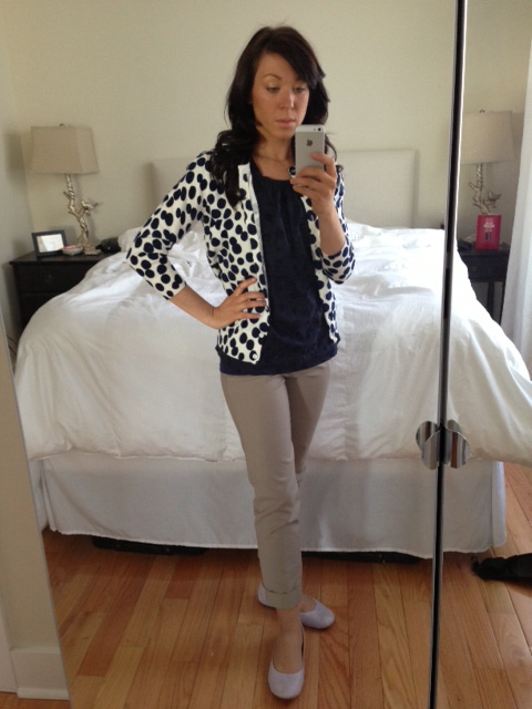 Navy polka-dotted cardigan: Ann Taylor LOFT Outlet