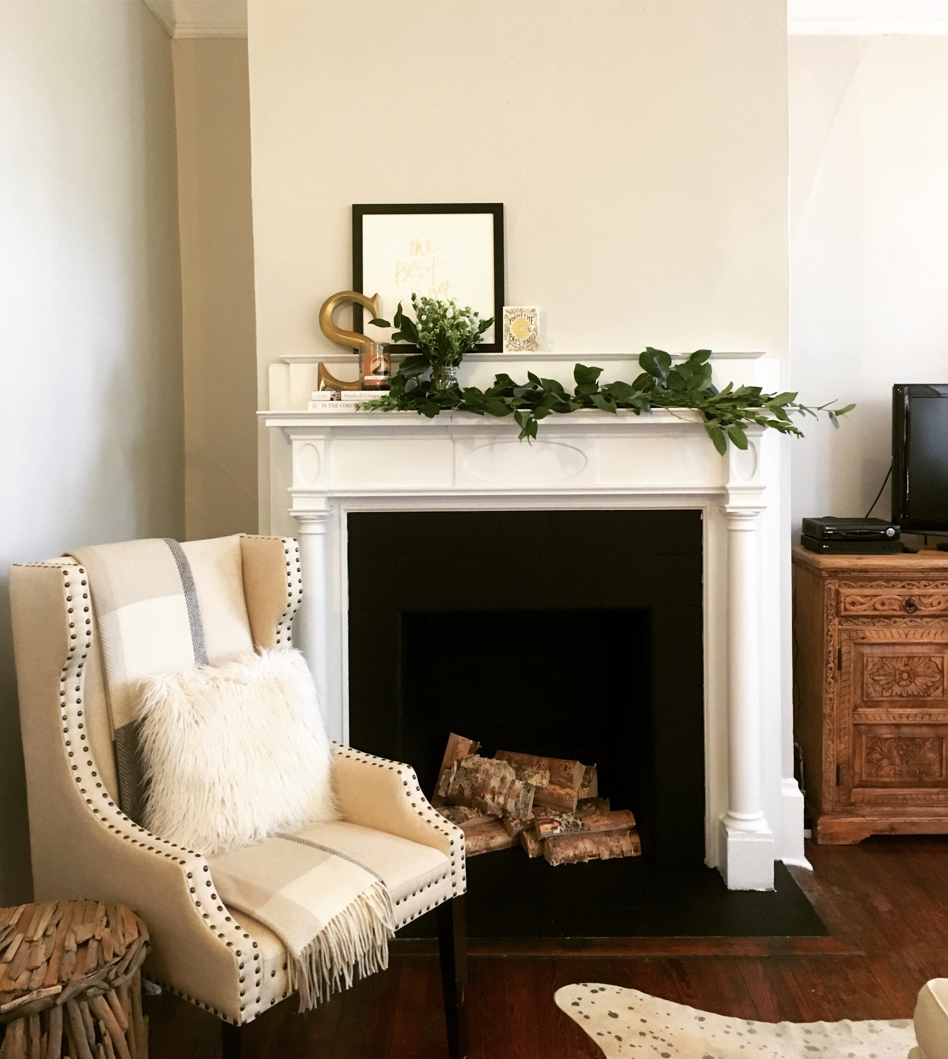 How do you feel about those green walls?? And the tiny sink in the corner, because there’s no sink in the bathroom 😳 But the fireplace is SO cozy! So, let’s see the BEFORE and AFTER.