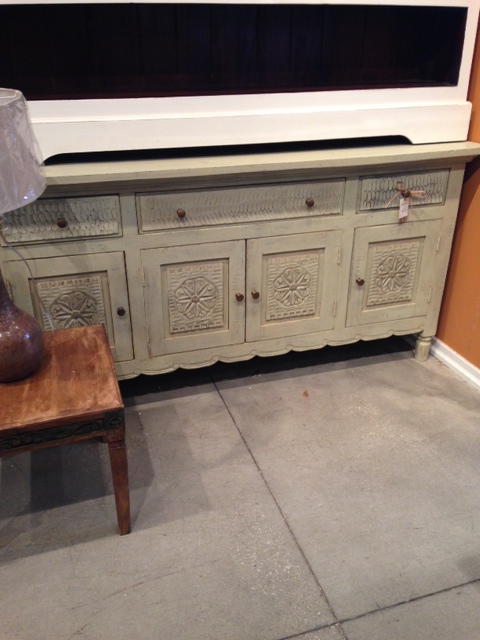 I can picture this carved, sage entertainment center in a pretty beach cottage.